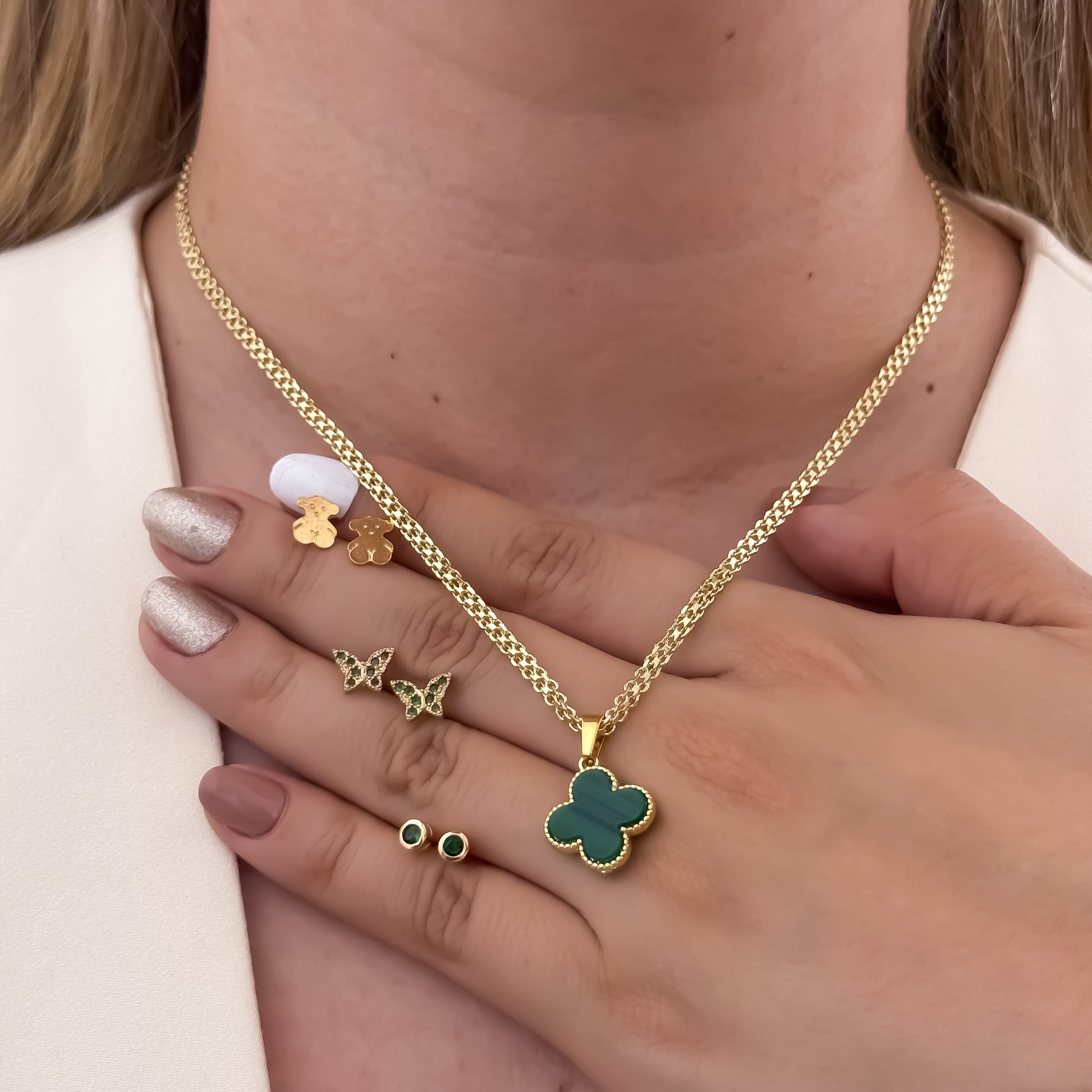 Cadena Tejido Chino 45 cm / 3 mm: fuerte, elegante y moderna. Dije de Trébol Verde: piedra color esmeralda, símbolo de suerte y abundancia. Topos de Osito: un toque tierno y encantador. Topos Mariposa Verde: diseño sofisticado y femenino. Topos Verde Esmeralda: el clásico toque brillante que combina con todo. Elaborado en oro laminado 18K con 8 capas reales.