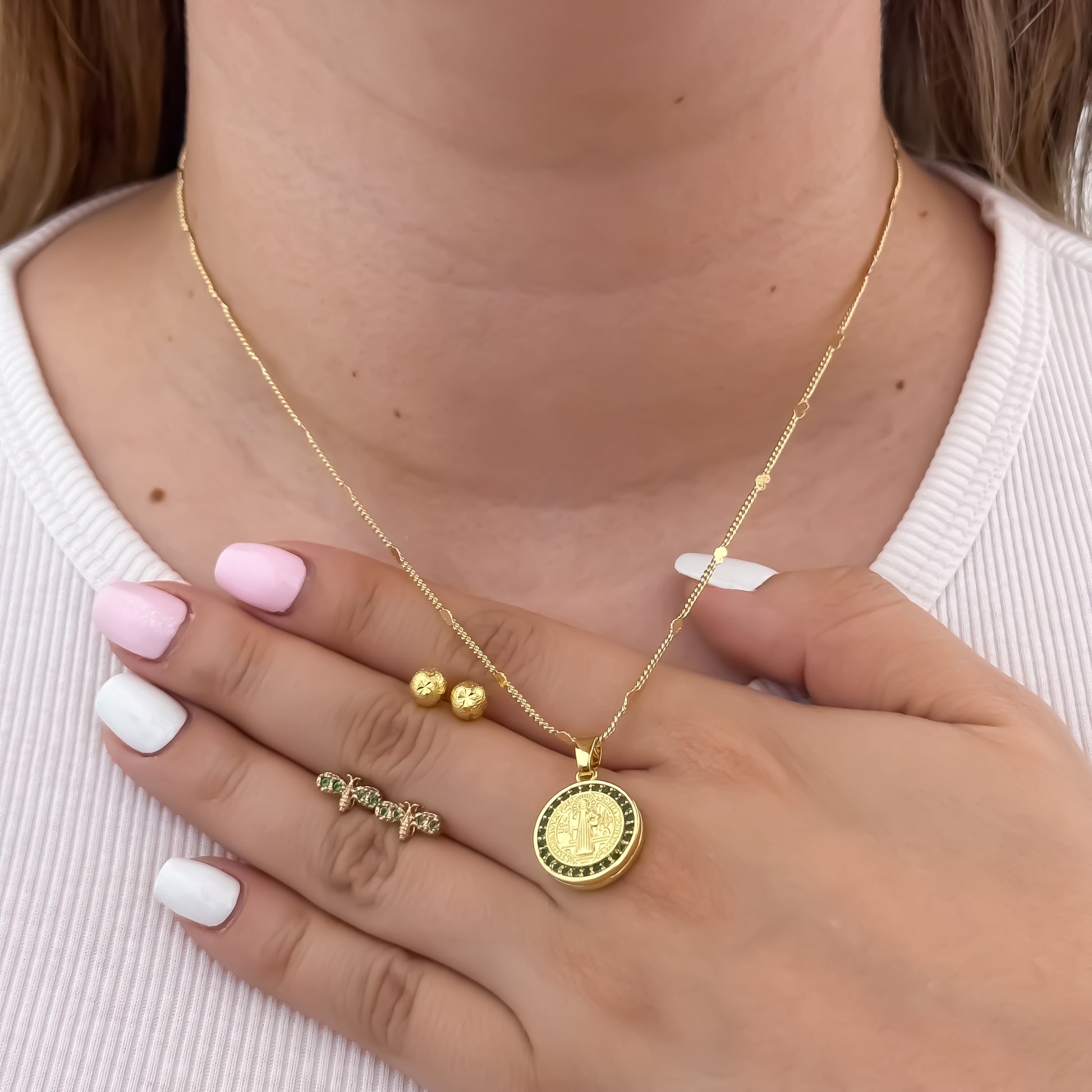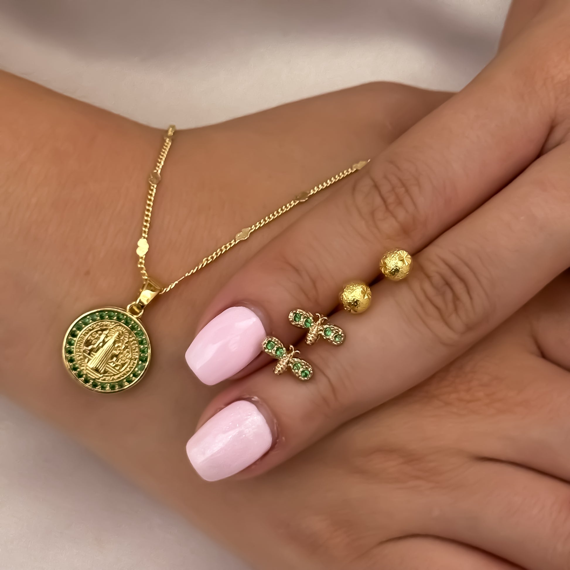 Porque quieren verse elegantes sin gastar una fortuna, tener una joya que no se decolora, y sentir que cargan un amuleto protector con ellas todo el día. Este set combina: 💛 Cadena cubana para dama💛 Dije de San Benito rodeado de circones verdes (protección)💛 Aretes tipo balín💛 Aretes mariquita con circones verdes Todo elaborado en oro laminado 18K de 8 capas, resistente, duradero y con un brillo igual al oro sólido.